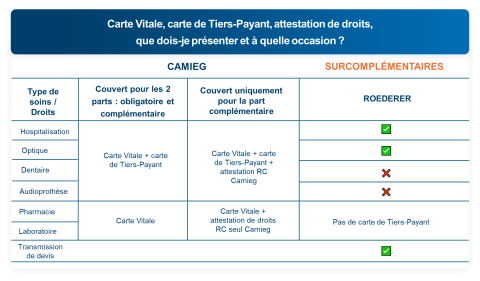 - Une carte unique où vous serez dispensés d'avancer les frais aussi bien pour vos garanties CAMIEG (régime complémentaire) que pour celles de votre couverture supplémentaire Roederer.